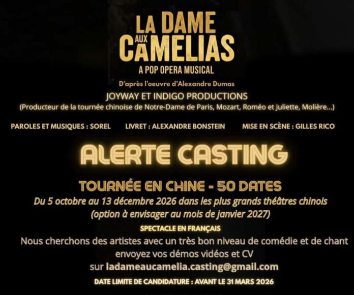 Casting pour La Dame aux camélias, un pop opera musical. Paroles et musique : Sorel. Livret : Alexandre Bronstein. Mise en scène : Gilles Rico.