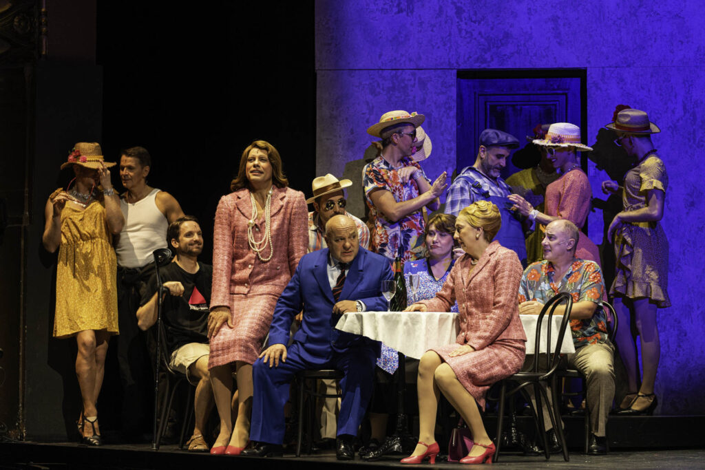 Pour qu'il réussisse, ce retour aux origines passe par la prise en considération de ce que signifie la présentation au public français d'une œuvre d'inspiration française. La traduction, l'adaptation d'Olivier Py se distingue par sa qualité linguistique, son sens conjugué de la modernité et d'une forme plus traditionnelle du théâtre, sans tomber dans la vulgarité, qui peut être son péché véniel. Dans le registre comique, les reparties font mouche, les répliques fusent : « Elle l'a porté neuf mois, j'aurais fait mieux en huit ! » ; et la leçon de maintien viril est toujours aussi craquante (comme la biscotte). La religion en prend pour son grade : « En bonne catholique, l'humiliation est ma joie ! » Côté devoir de mémoire, c'est un militant d'Act Up qui se mêle à la foule des Tropézien·ne·s. À la richesse des mots et la pertinence des images se développe une mise en scène qui véhicule fièrement l'acte politique du livret. De manière appuyée ? Sans doute, mais à l'heure où les députés Dindon et autres casseurs des droits LGBTQI+ se multiplient autour de nous et, décomplexés, sont à la manœuvre dans nos sociétés, il est salvateur d'insister sur quelques droits fondamentaux.