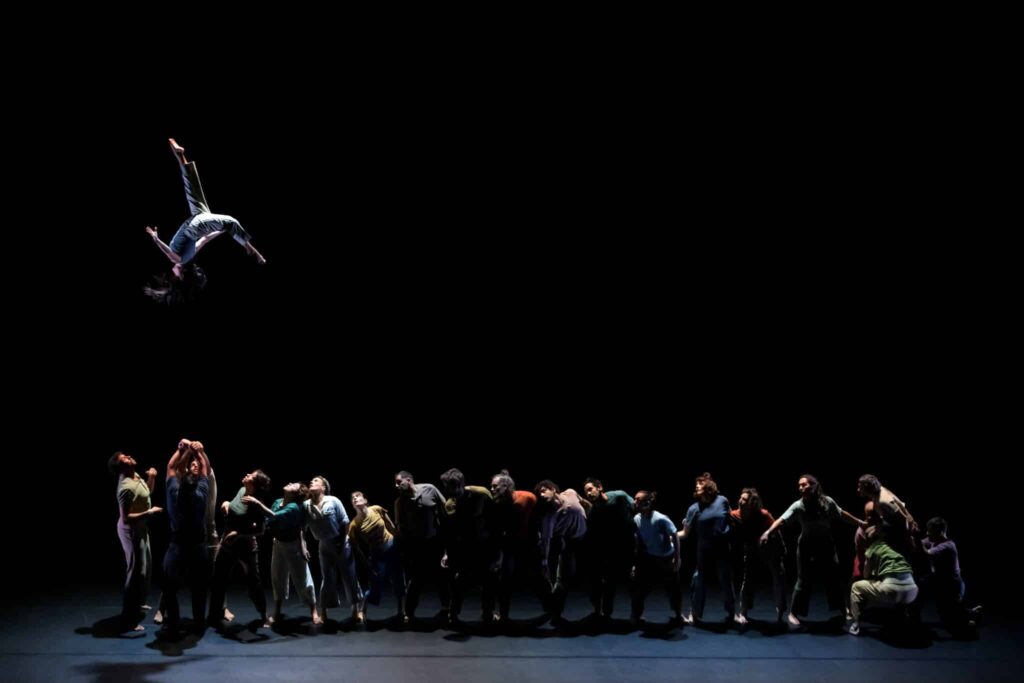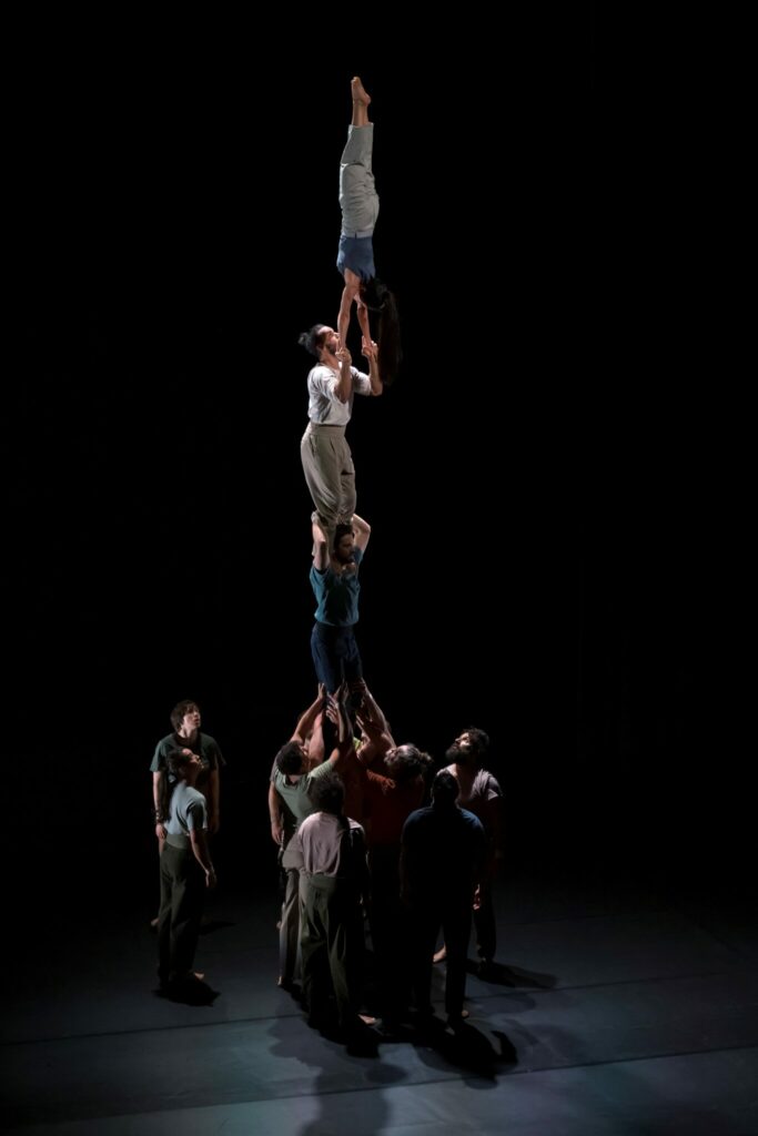 Notre avis (représentation du 8 novembre 2025) : Ce Pas du monde se révèle tout simplement un pur régal. D'abord, les yeux sont saisis par d'époustouflantes acrobaties : vingt-deux corps qui s'articulent, s'empoignent, se dressent avant de planer, de voler, de flotter comme en apesanteur ; des amas d'où émergent des silhouettes avant d'être englouties ; des constellations qui spiralent ; des colonnes qui s'érigent avant de se désintégrer... En même temps que ces spectaculaires prouesses se déploient, on est irrésistiblement envahi de sensations, emporté par un tourbillon d'évocations. Dans ces paysages humains qui s'enchaînent avec une fluidité virevoltante comme dans un élan cinématographique, vous décèlerez peut-être comme nous la proue d'un navire qui brave les flots, la déchéance d'un héros tout juste porté aux nues, une fière montagne qui s'érode, la chute d'un oiseau touché en plein vol, une forêt qui ondule sous la pluie, un foule de citoyens contestataires, une désopilante ménagerie... Poésie, réalisme, humour, tendresse, dérision, grandeur... tous les prismes cohabitent. La force de proposition s'impose, vaste, tout comme l'universalité du propos, d'autant plus que le chant s'invite, envoûtant par sa tonalité folklorique, évident comme un appel tellurique ou une déclamation céleste, et se joint au concert des corps – dans une langue inventée, comme nous confiaient Virginie Benoist et Julie Calbete dans l'entretien qu'elles nous ont accordé, qui à la fois humanise le geste vocal mais laisse le spectateur entendre les mots qu'il souhaite : à chacun.e d'imaginer son histoire.