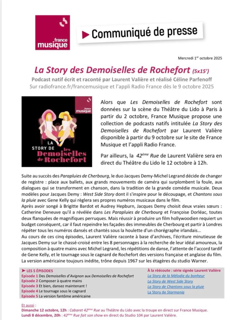 L'un des spectacles musicaux très attendus en cette rentrée est indéniablement Les Demoiselles de Rochefort au Théâtre du Lido. Tandis que la première se tiendra le 2 octobre, Laurent Valière, le producteur phare de France Musique en matière comédies musicales, propose deux rendez-vous pour marquer l'événement.