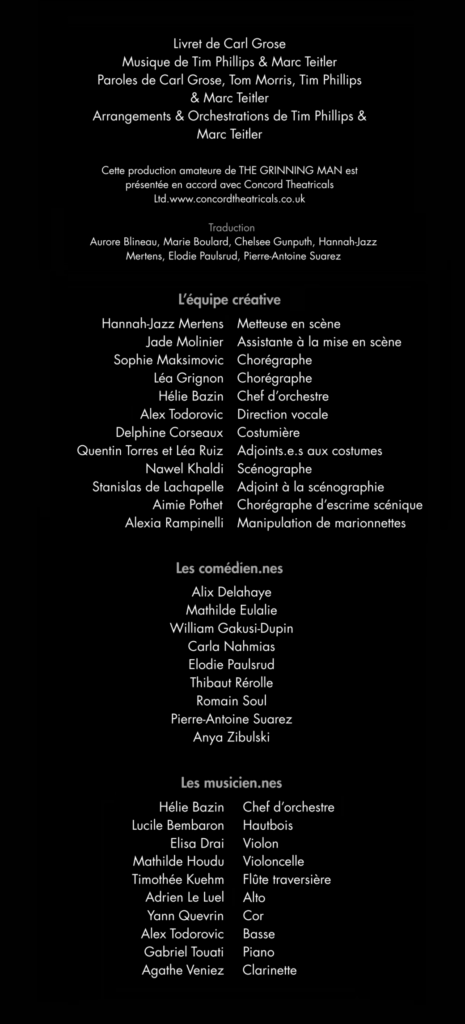 La compagnie Side by Side présente la comédie musicale L'Homme qui rit, adaptation en français de la pièce The Grinning Man, elle-même adaptée du roman de Victor Hugo.