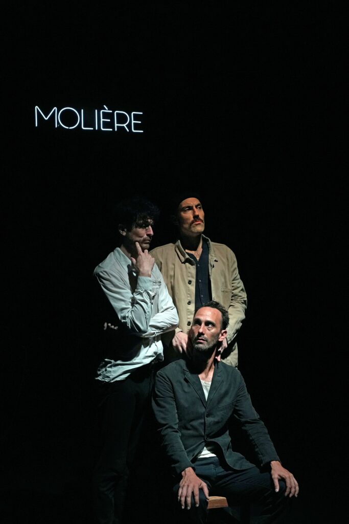 De sa décision de ne pas reprendre la charge de tapissier de son père jusqu'à sa mort (presque) sur scène, les trois comédiens nous racontent avec une fantastique énergie la vie et l’œuvre de l'auteur dramatique et comédien, fondateur de l'Illustre Théâtre. Étienne Lumeau joue Molière, Clément Beauvoir et Lucas Henaff se partagent tous les personnages qu’il a rencontrés. Ce qui pourrait être une banale biographique théâtralisée se trouve propulsé en un spectacle jubilatoire. Les trois comédiens-auteurs ont tissé avec beaucoup d’intelligence un spectacle mélangeant narration et dialogues issus des pièces de Molière subtilement glissés dans les dialogues en parfait écho aux situations. Ils nous entraînent dans un véritable tourbillon, accompagnés par Joseph Robinne qui joue en direct la bande-son de ce spectacle survitaminé.
