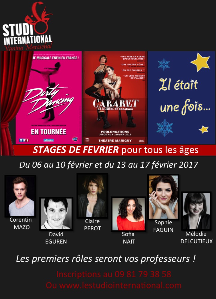- Un stage CABARET du 13 au 17 février de 10h à 17h avec Claire PEROT (rôle principal féminin: Sally Bowles) et Sofia NAIT (La Belle et la Bête, Sister Act, Fame...).